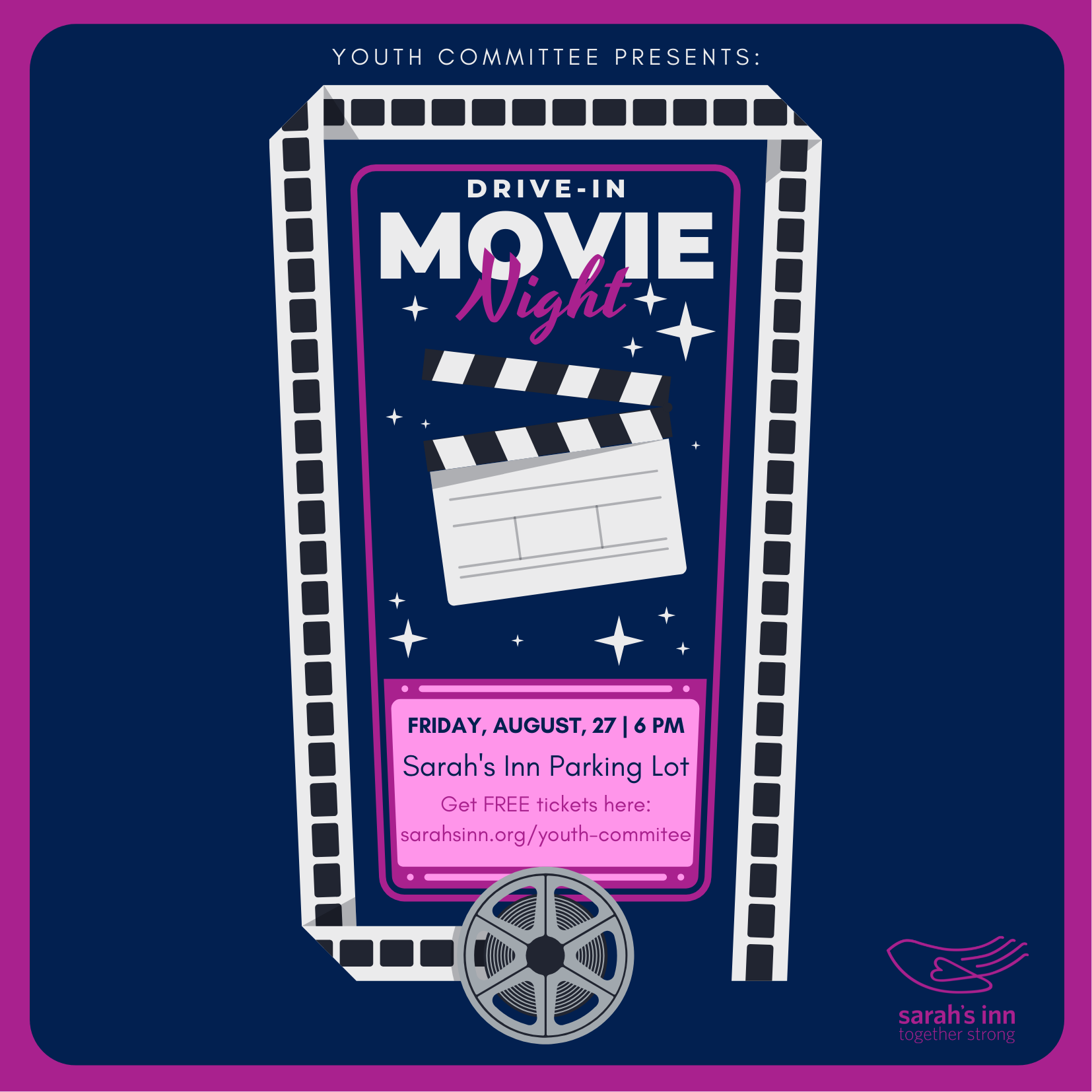 Join the Sarah’s Inn Youth Committee for a Drive-In Movie Night on Friday, August 27 at 6pm in the Sarah’s Inn parking lot. This event is for high school students only and face coverings are required. Register here to get your free tickets.