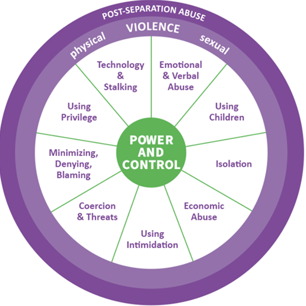 While every experience of DV is unique, survivors experience a loss of control over their own life and wellbeing. The Power and Control Wheel was developed to identify common patterns of behaviors that survivors can experience from an abusive partner. Abuse includes any act, whether physical, emotional, verbal, in nature and impact, that one person takes to force their will on another.